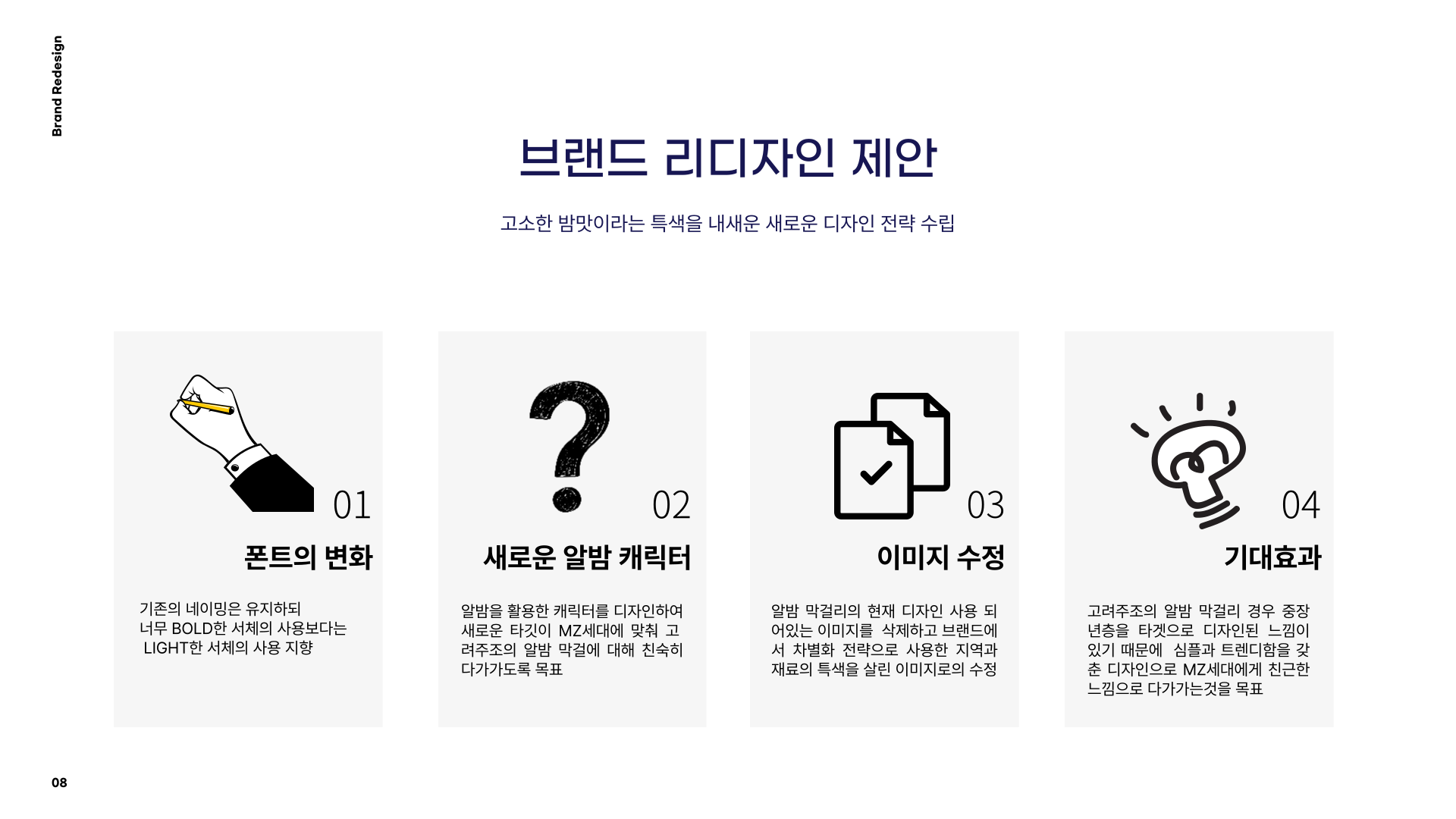 - 다음에 할때는 어떻게 디자인을 바꿀지 좀 쉽게 정리를 해야할것 같다. 예를 들면은 알밤 막걸리의 이미지를 놓고 점과 선을 통해 어느 부분에 변화가 필요하지 가벼운 표시를 한다거나 하는등