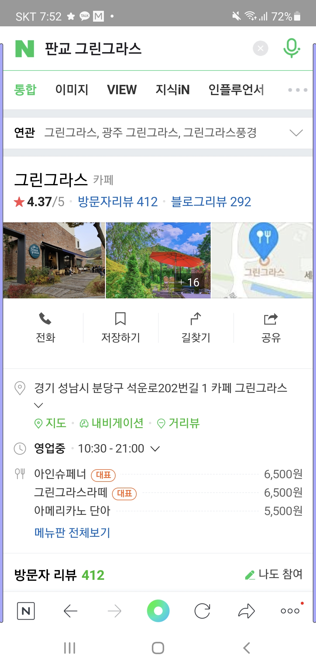 고기리에서 밥을 먹은 후 주변의 예쁜 카페를 찾다가 가까운 석운동 카페 그린그라스로 방문을 결심했고 각자 먹고 싶은 음료들을 주문했다.
