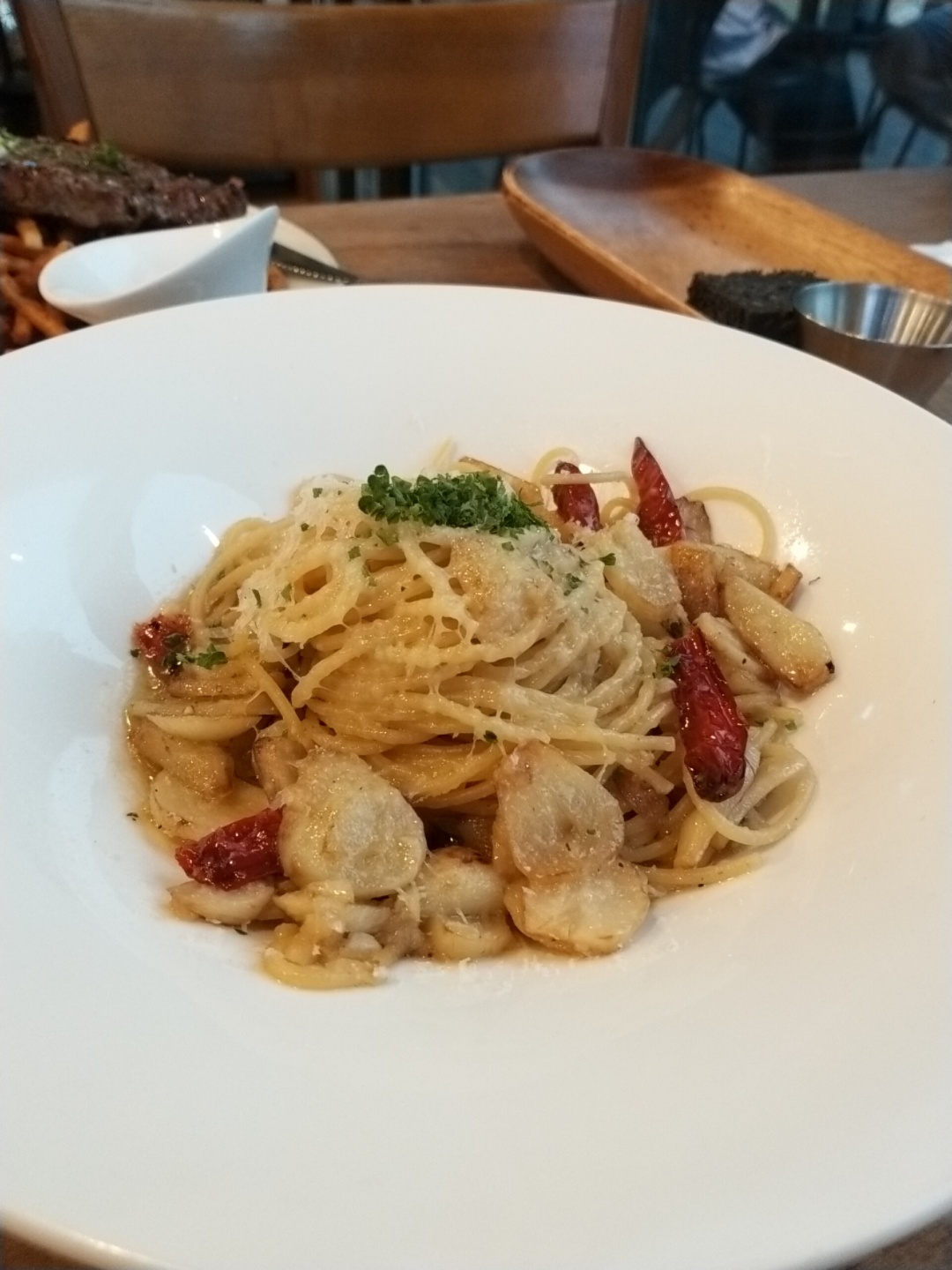 오늘 주문한 메뉴로는 나는 '오일 해산물 파스타' 언니는 '알리오 올리오' 사이드로는 '등심 스테이크 with 감자튀김'을 시켰다. 평소에는 오일과 오일의 조합을 잘 먹지는 않지만 언니도 오일 파스타가 먹고 싶다며 알리오 올리오를 주문했다. 나는 해물과 함께 있는 오일 해산물을 추천해줬는데 알리오 올리오로 오직 마늘과 파스타를 즐기고 싶다며 주문을 완료했다 ㅋㅋㅋㅋㅋㅋㅋㅋ 식전 빵을 먹은 지 3분이 안되어 주문한 메뉴들은 금방 나왔다.