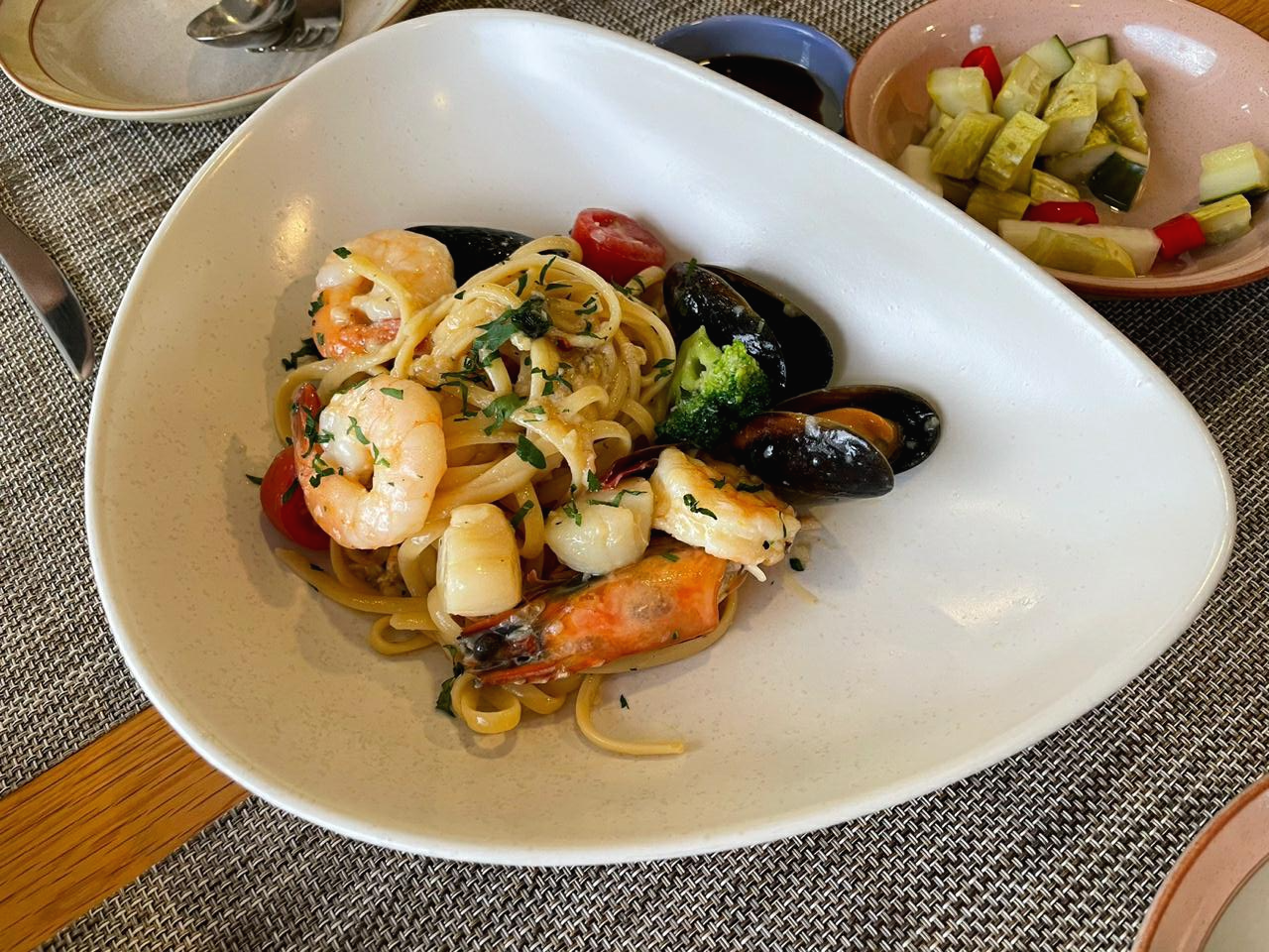 마레 파스타 ( 오일 )의 면은 좀 신기하다 느껴졌다. 일반적으로 먹는 파스타 면이 아닌 그보다 살짝 더 넓적한 면으로 파스타의 식감을 충분히 느낄 수 있었고 오일의 소스 또한 일반적인 알리오 올리오 소스에 살짝의 맛있는 담백함을 더한 느낌이었다. 관자는 비린 맛이 나지 않고 소스가 풍부히 배어있어 맛있었으며 블랙타이거 새우가 들어가서 그런지 일반적인 파스타에 들어간 새우보다 더 크고 통통하다라 느껴졌다.