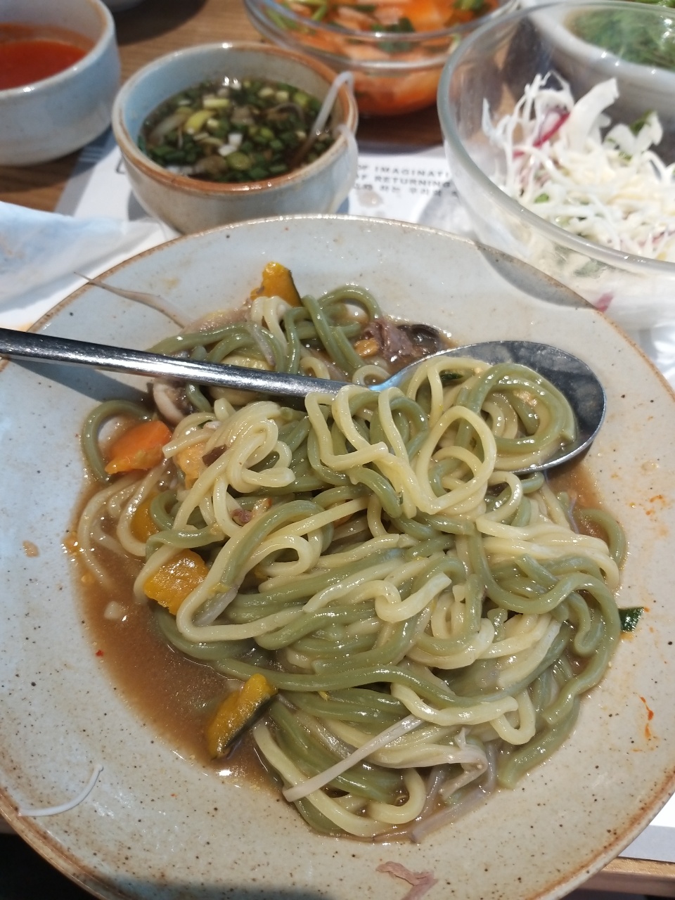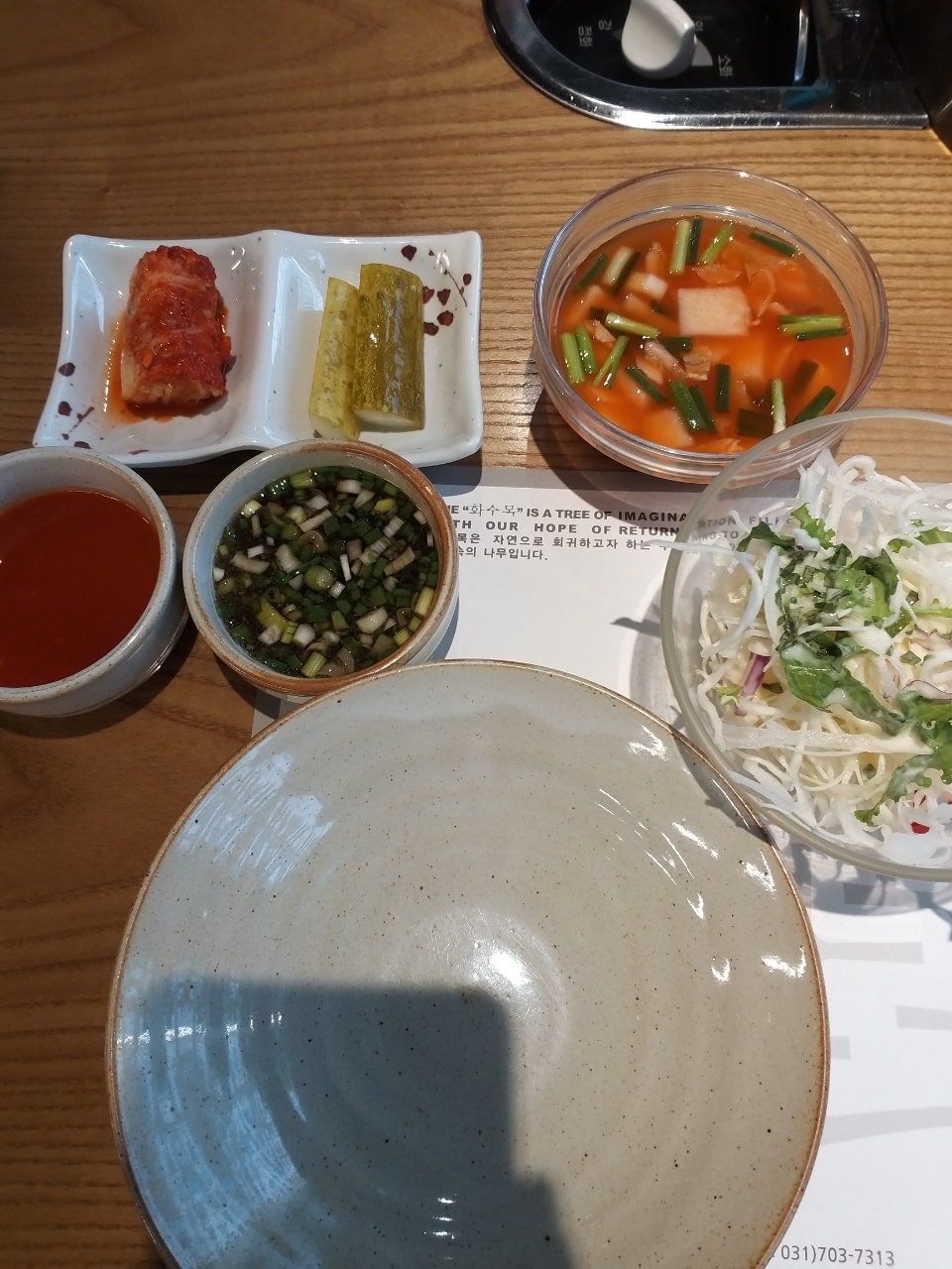 왼쪽부터 초장, 간장 소스 , 동치미, 샐러드가 기본 반찬으로 나온다. 초장은 회와 함께 먹는 센 맛의 초장이 아닌 담백한 소스였고 간장은 물만두를 찍어먹을 때 먹는 딱 그 간장의 소스 맛이었다. 또 다른 간장 소스가 추가적으로 나오는데 그 소스는 고추냉이에 간장을 풀어넣은 맛이다. 동치미와 샐러드는 우리가 아는 그 맛이다.