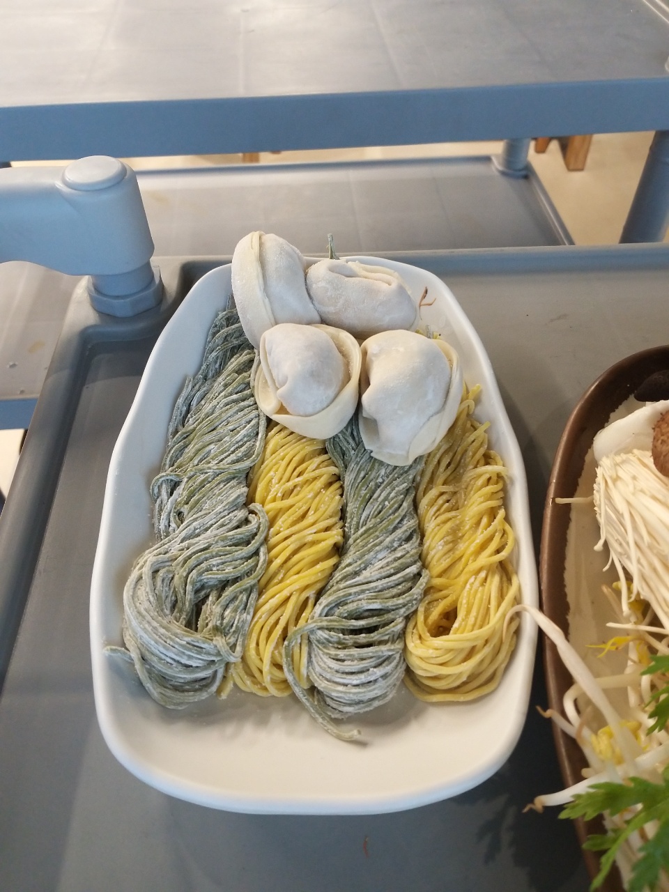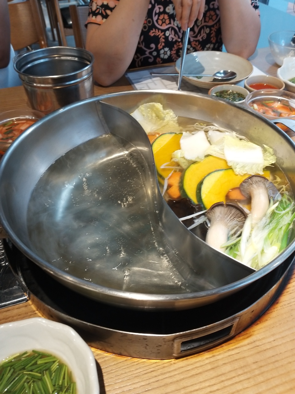 이렇게 아무것도 없는 육수가 훠거의 냄비처럼 칸으로 나뉜 채 나온다. 왼쪽 칸에는 해산물을 오른쪽 칸에는 다양한 야채와 고기를 넣고 먹을 수 있도록 되어있다.