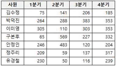 다음 중 아래 데이터를 차트로 작성하여 사원별로 각 분기의 실적을 비교·분석하려는 경우 가장 비효율적인 차트는?