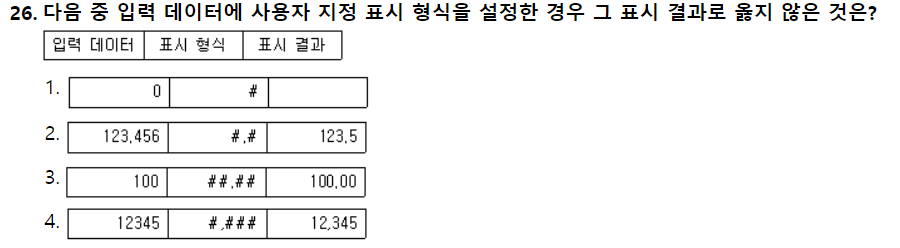 -> 1번 #은 유효한 숫자만 표시하기 때문에 0은 표시결과로 아무것도 나오지 않는다. 2번 #.#은 유효한 숫자와 소수점 그뒤에는 반올림한 한자리의 수만이 나와야함을 의미한다. 3번을 보면 소수점 뒤에 #이 두개가 있지만 0은 유효하지 않은 숫자이기 때문에 쓸 수 없다.