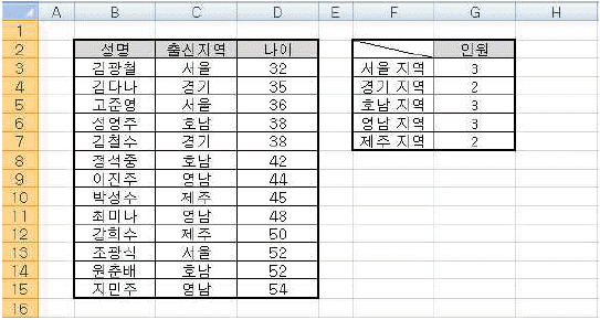 아래 워크시트의 [C3:C15] 영역을 이용하여 출신지역 별로 인원수를 [G3:G7] 영역에 계산하려고 한다. 다음 중 [G3] 셀에 수식을 작성한 뒤 채우기 핸들을 사용하여 [G7] 셀까지 수식 복사를 할 경우 [G3] 셀에 입력할 수식으로 옳은 것은? <맞음> |