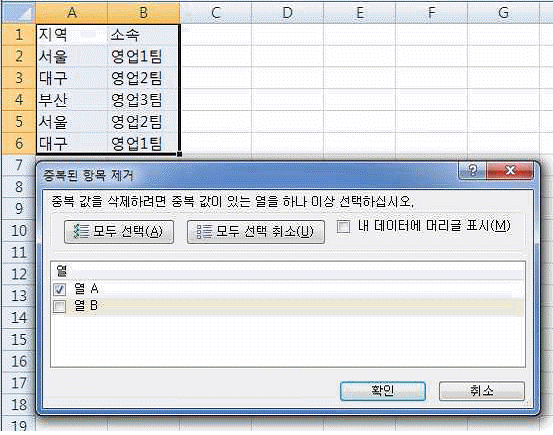 위 대화상자에서 '열 A'와 '열 B'를 모두 선택하고 실행하면 '중복된 값이 없습니다'라는 메시지 박스가 나타난다. ->열에서 똑같은 값이 있으나 같이 보면은 온전히 똑같은 값은 없기 때문에