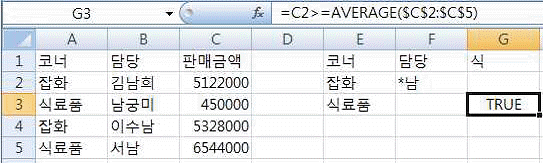 코너가 '잡화' 이거나 담당이 '남'으로 끝나고, 코너가 '식료품'이거나 판매금액이 판매금액의 평균 이상인 데이터
