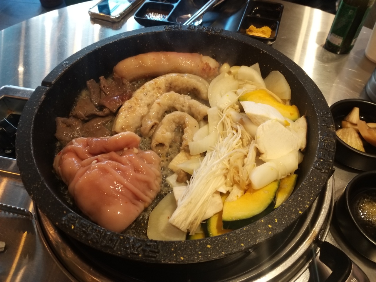 모둠에는 곱창, 막창, 염통, 대창이 나오는데 옆에 떡 , 팽이버섯, 단호박, 양파 등 같이 나오기 때문에 곁들여 먹기 아주 좋다. 개인적으로는 떡이 마음에 들었는데 어느 정도 익으면은 말랑말랑 한 것이 곱창의 기름과 함께 고소하게 먹을 수 있다.