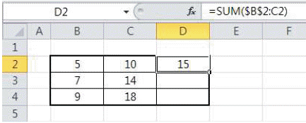 다음 중 아래 워크시트에서 수식 '=SUM($B$2:C2)'이 입력된 [D2]셀을 [D4] 셀에 복사하여 붙여 넣었을 때의 결과 값은?