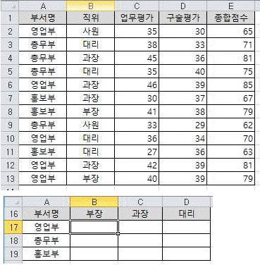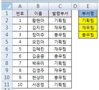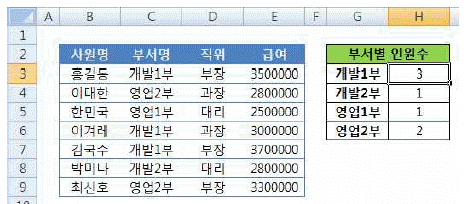 다음 중 아래 시트에서 부서별 인원수[H3:H6]를 구하기 위하여 [H3]셀에 입력되는 배열 수식으로 옳지 않은 것은?